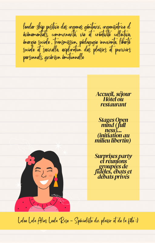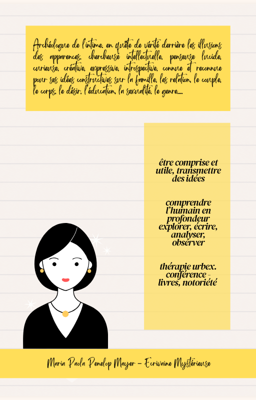 thérapeute pour couple, spécialisé dans les organes génitaux - chanteuse internationale gitane de chansons d’amour, sexy et rebelle, classe et sensuelle, folle dans un asile thérapeutique, infiltrée des services politiques couchant et recueillant des preuves pour faire tomber les ennemis. écrivaine mystérieuse et torturée, historienne, archéologue, recherchant la vérité, organisatrice d'évènementiel musical alternatif (fiesta), muse éternelle aux longs cheveux bruns ondulés, reine qui gère une armée de fidèle, gourou universelle, je dicte les règles de mon territoire imaginaire.